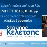 Την Πέμπτη 18 Μαΐου στις 20:00 ο βουλευτής με τη Νέα Δημοκρατία και εκ νέου υποψήφιος στον Έβρο, Σταύρος Κελέτσης, θα πραγματοποιήσει την κεντρική πολιτική του ομιλία στο Ξενοδοχείο Grecotel, στην Αλεξανδρούπολη. Σε συνέχεια, της επιτυχημένης ομιλίας του που προηγήθηκε στην Ορεστιάδα, την...